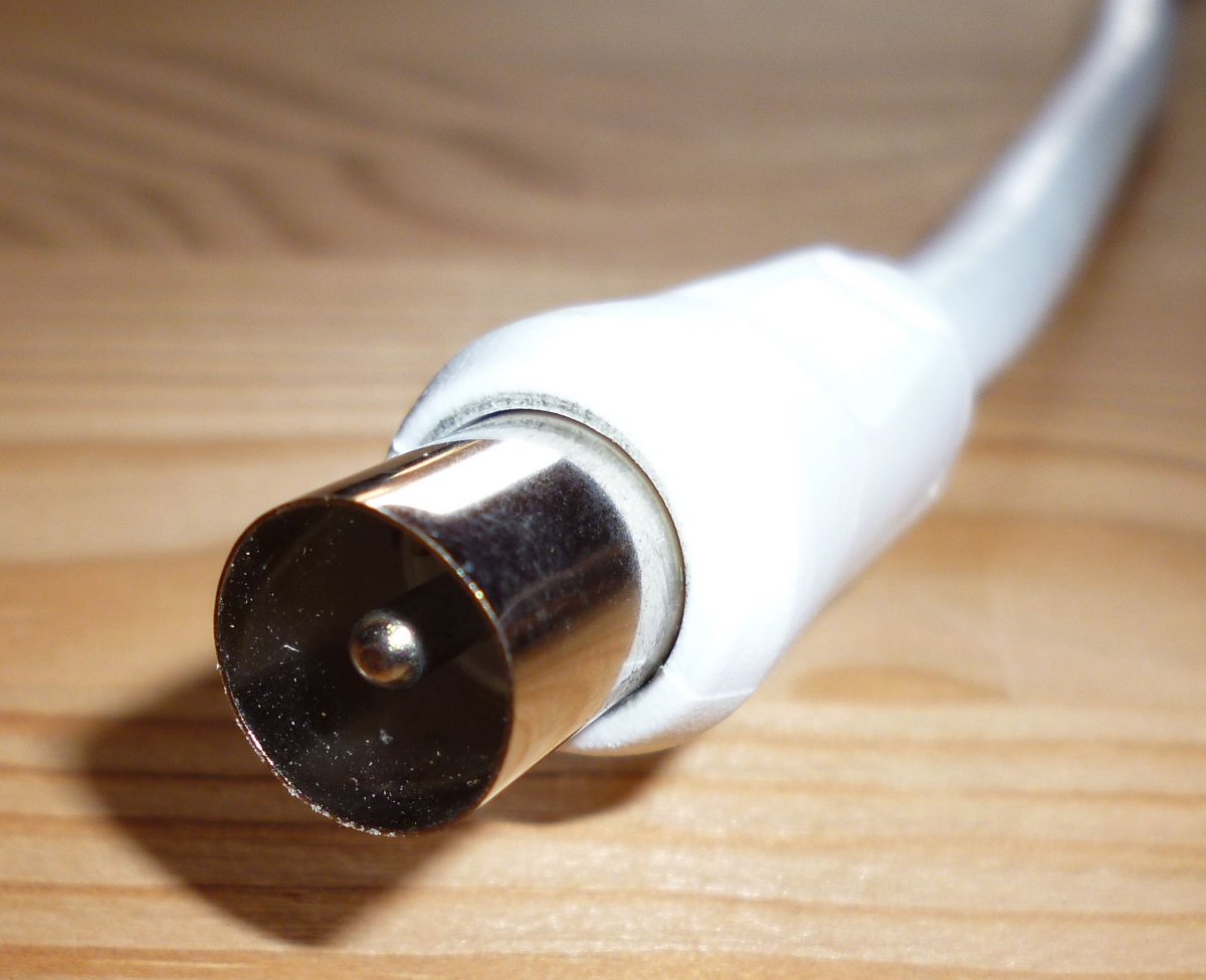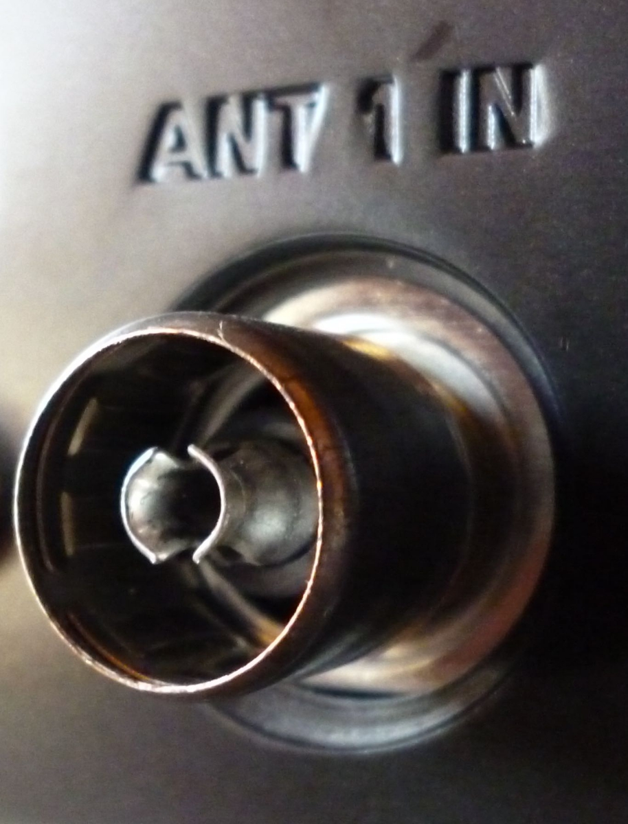 Prise mâle et femelle d'un câble BNC de prise d'antenne reliés à l'arrière d'un téléviseur